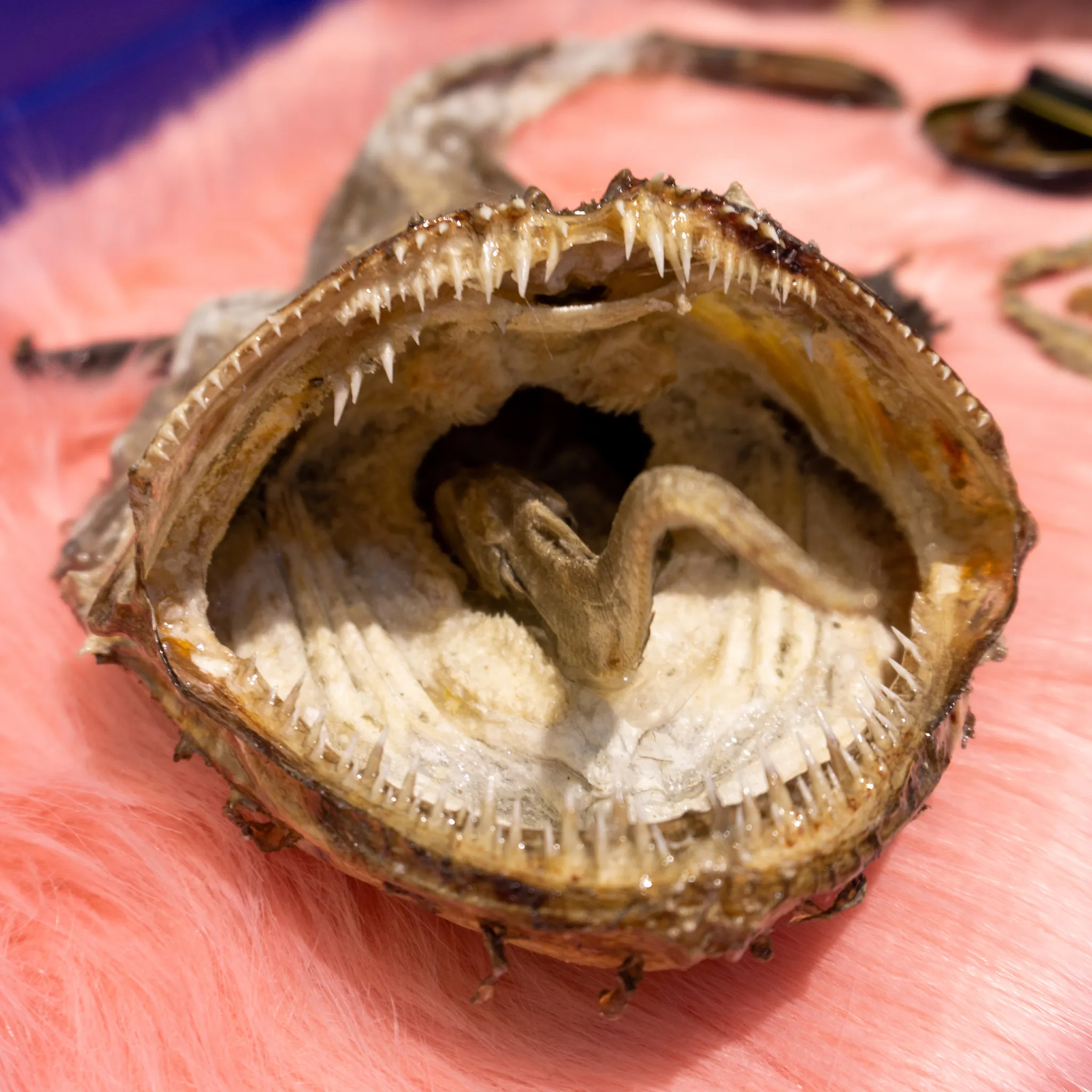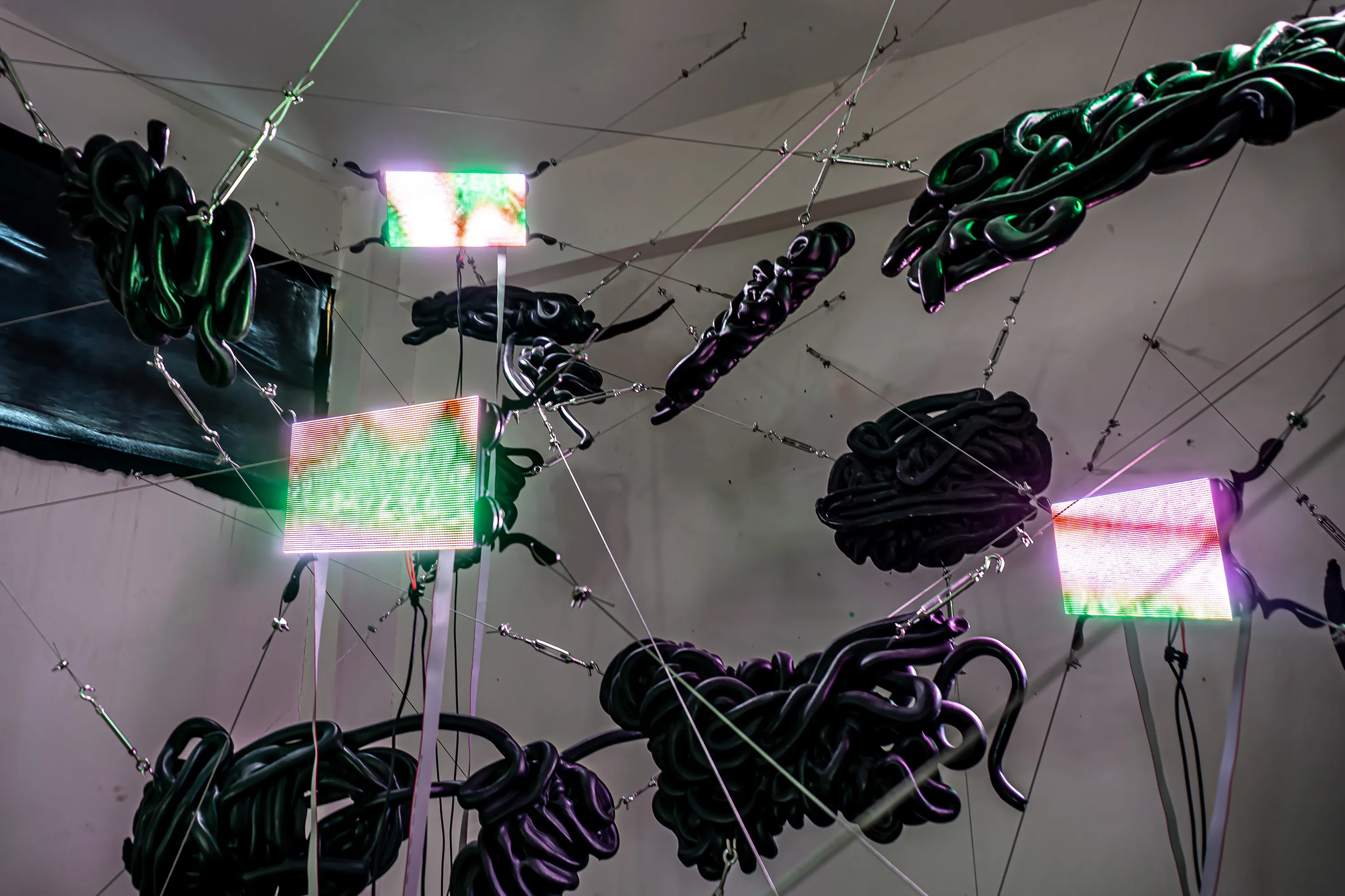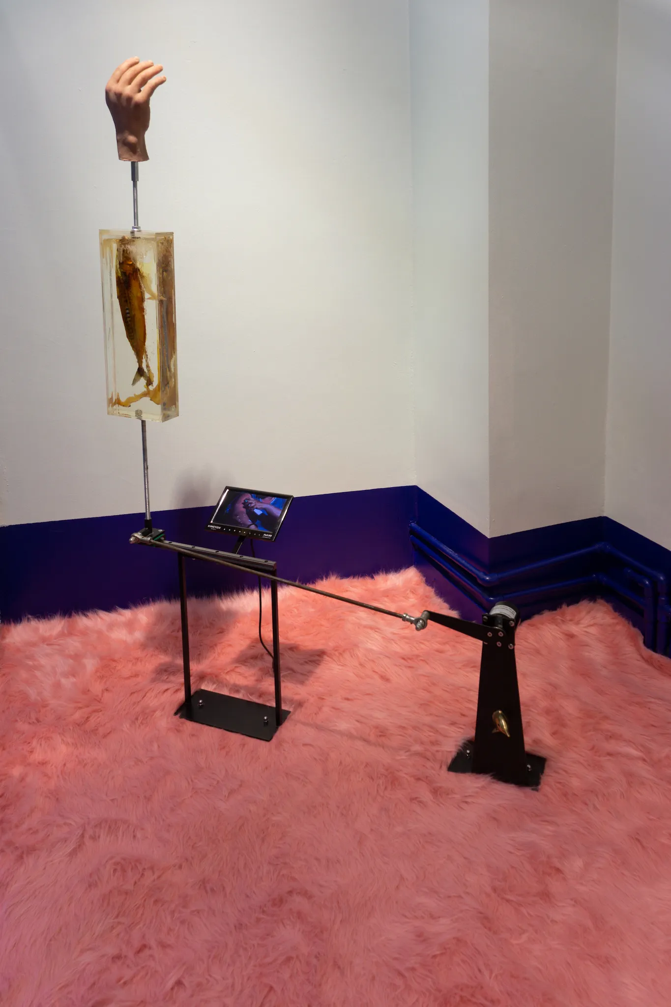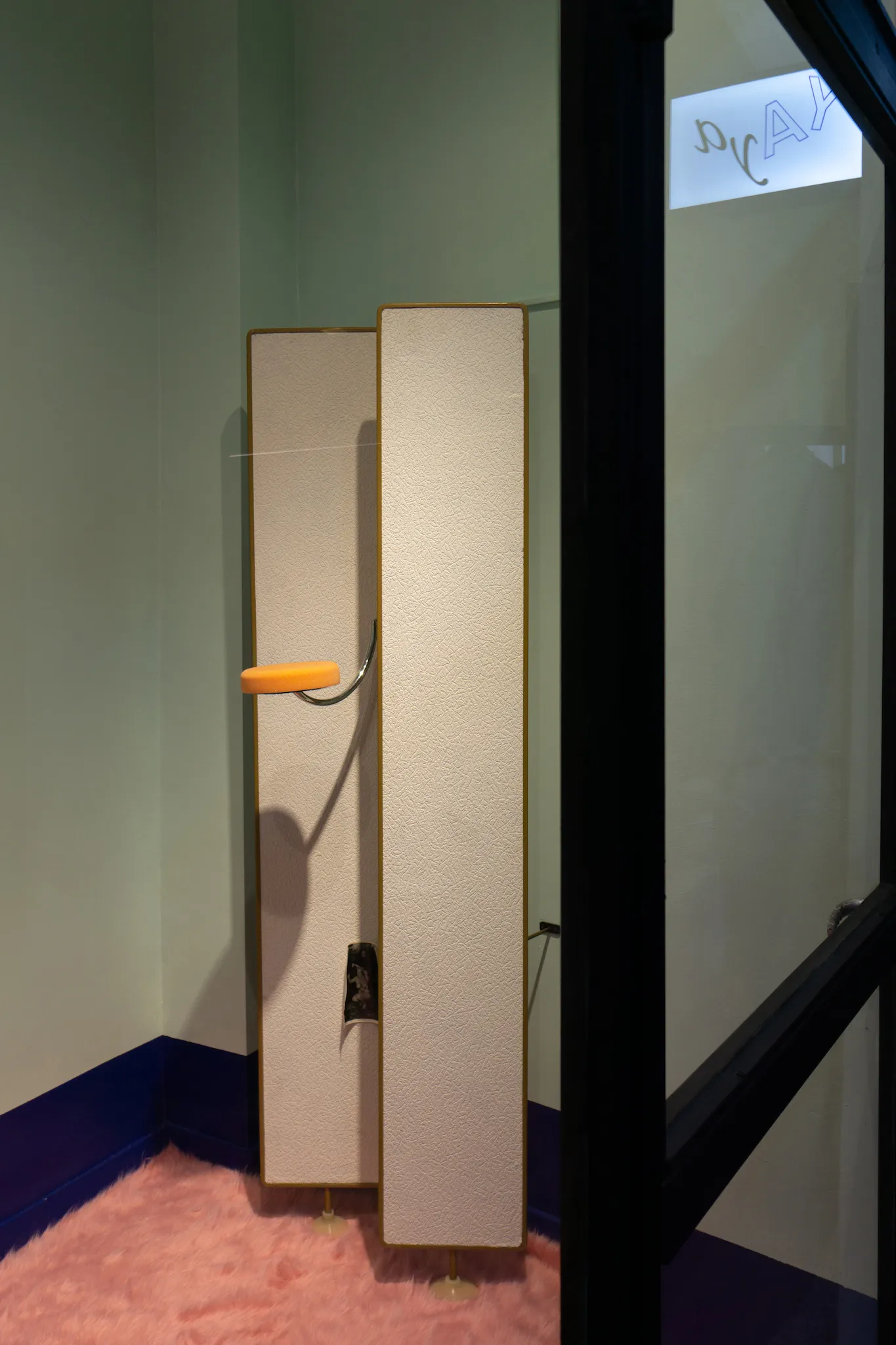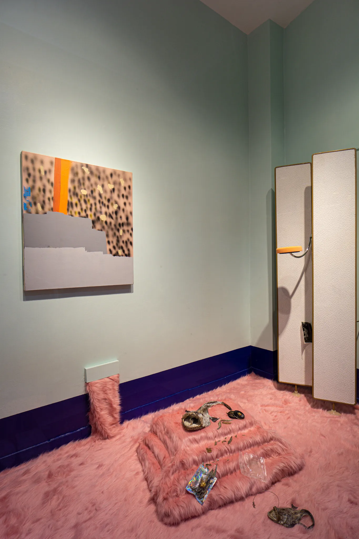After eight, Constanza disappeared. Gerald eventually opened his eye-lids and noticed that she was not in the room. After realising she was not in the bathroom he got up. He called her name as he walked through the hallway. He noticed a door being slightly ajar with light shining through it. As he pushed the door open his eyes were startled by the intense lights and colours that fell upon his dazed vision. There he found Constanza lying on her side resting on a bright pink, fur carpet with her back facing towards him. She wore an abstract, leopard printed dress and had kicked off some bright orange heels.