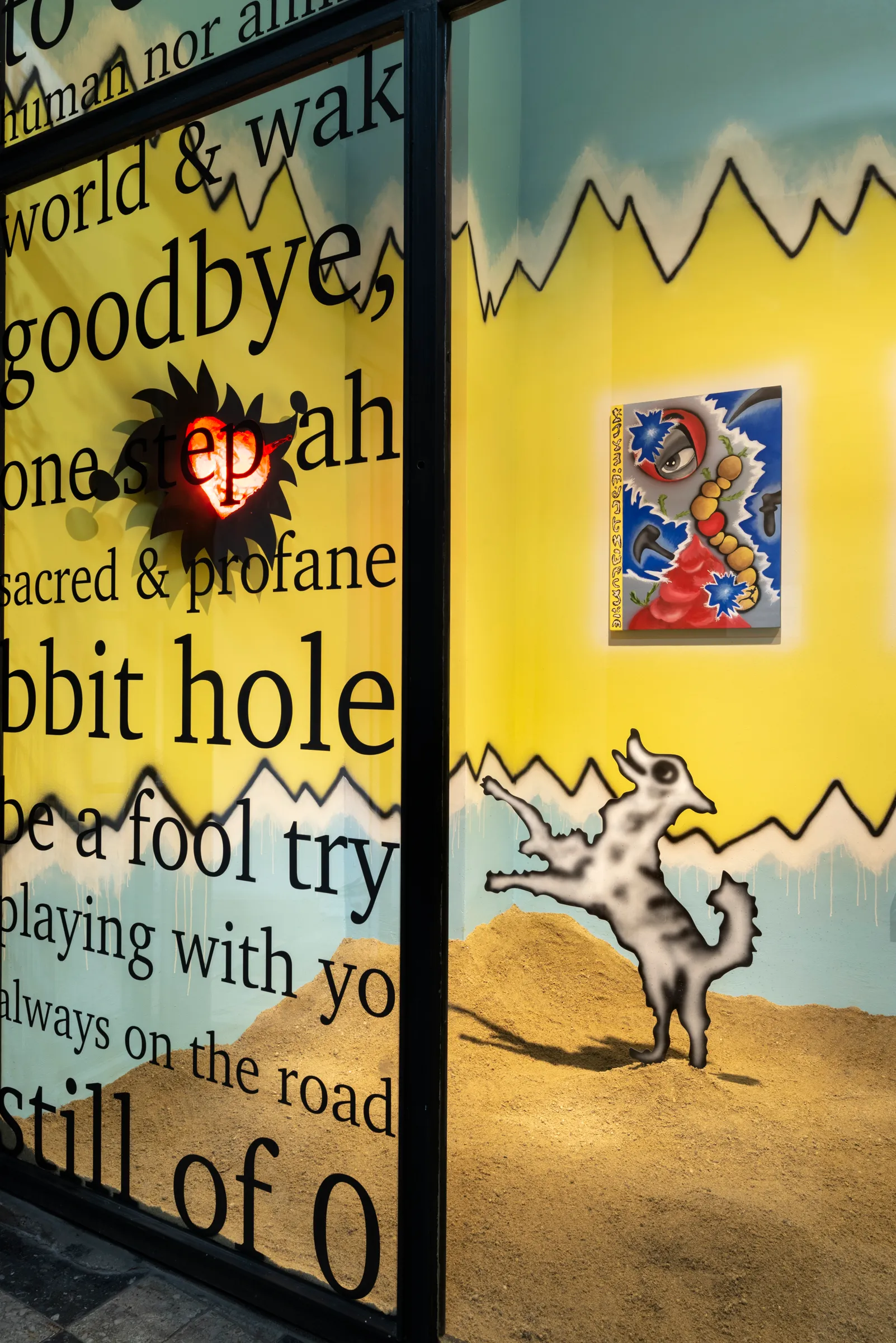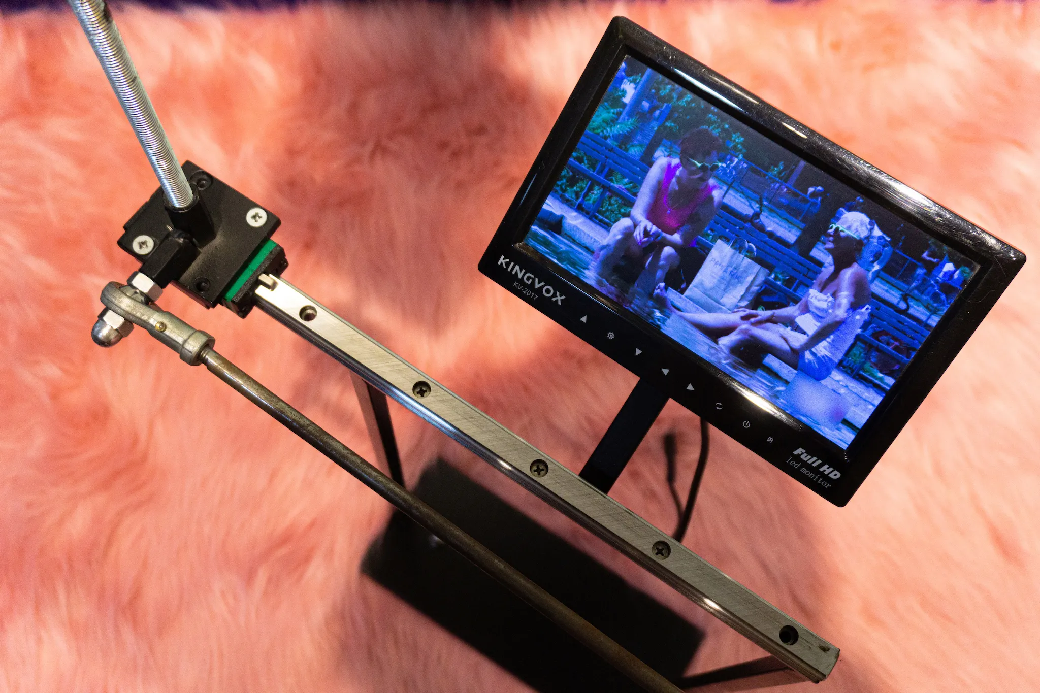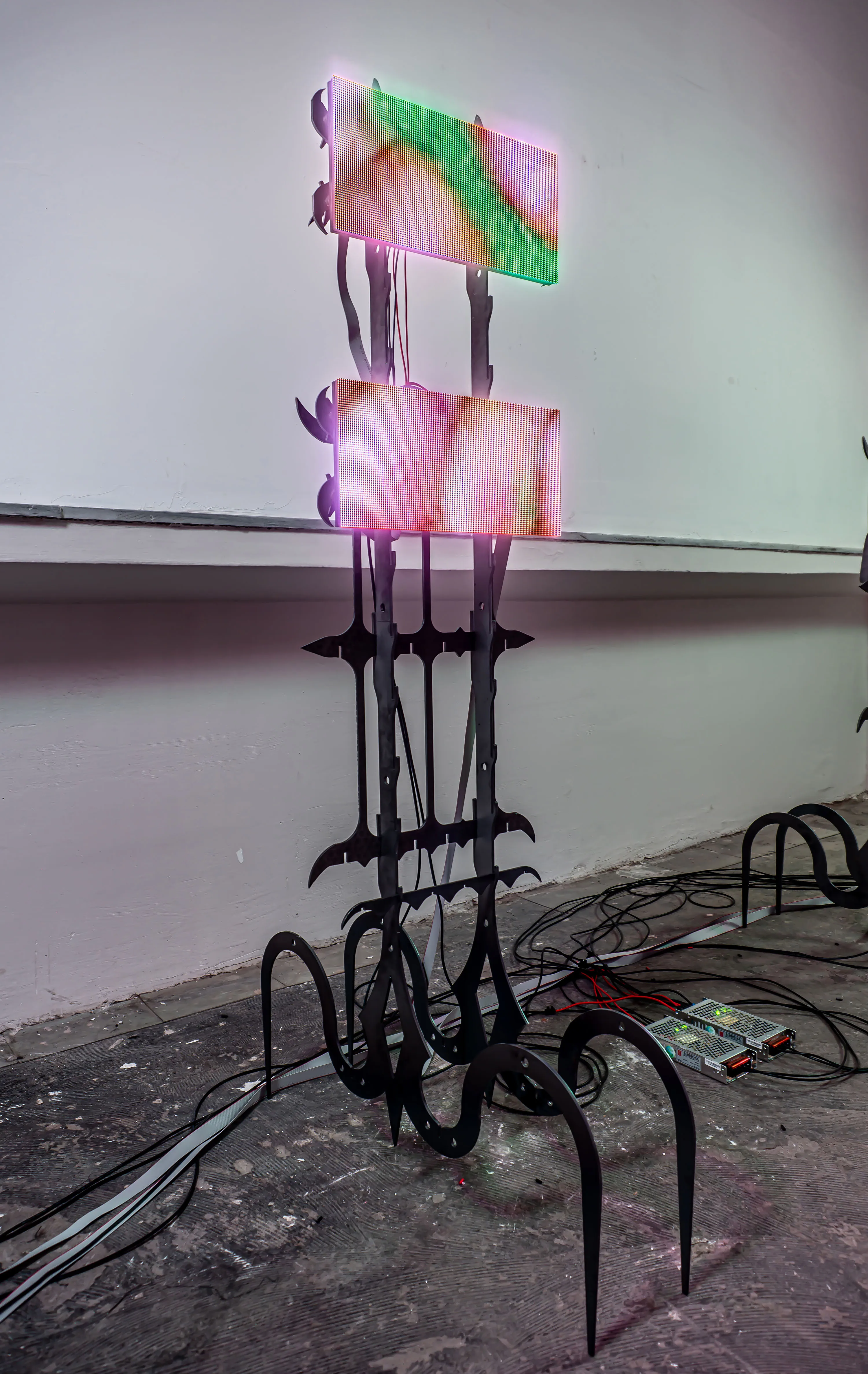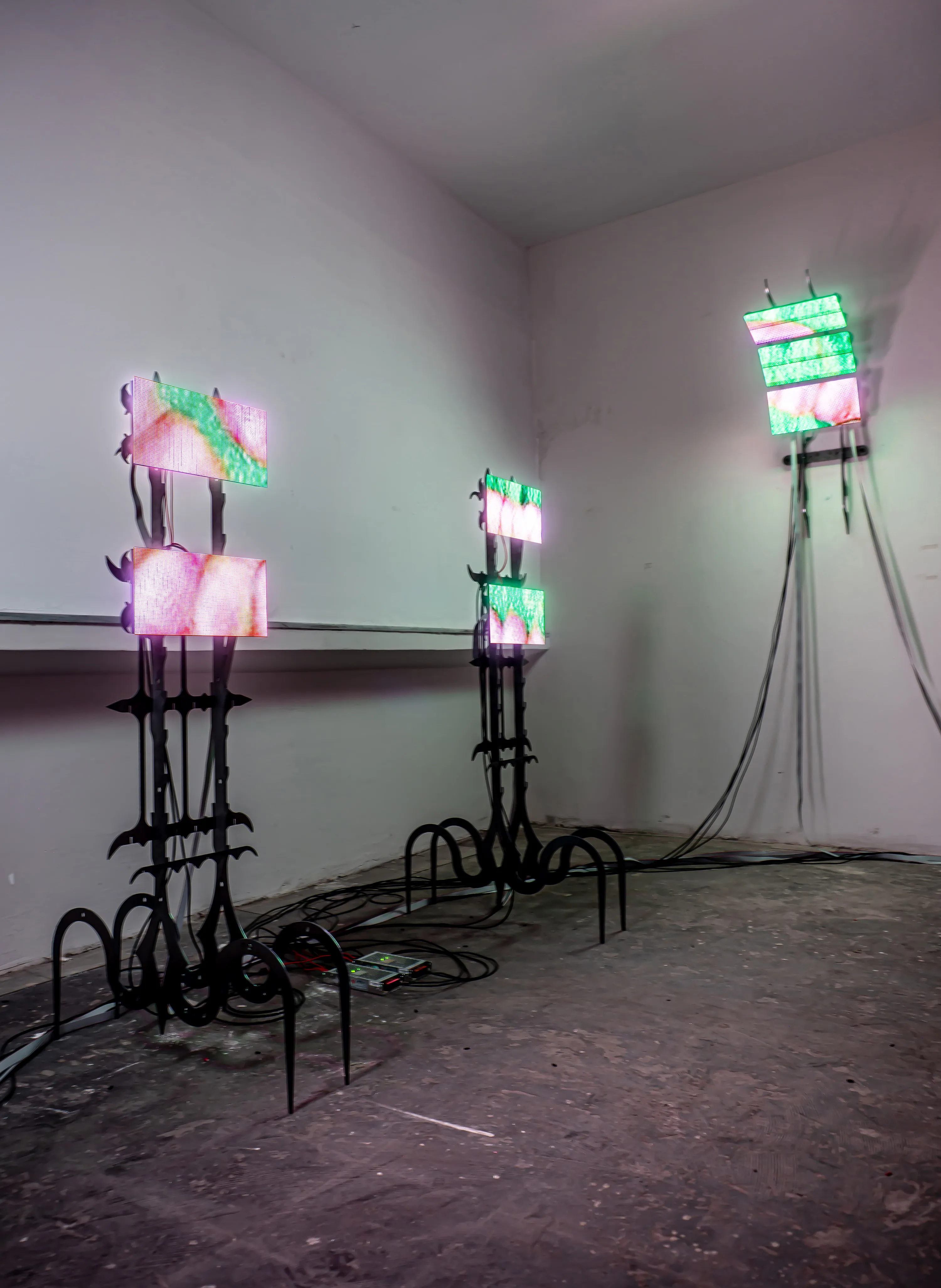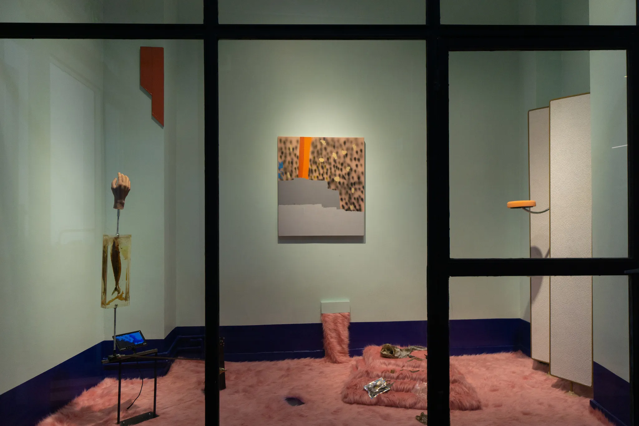 After eight, Constanza disappeared. Gerald eventually opened his eye-lids and noticed that she was not in the room. After realising she was not in the bathroom he got up. He called her name as he walked through the hallway. He noticed a door being slightly ajar with light shining through it. As he pushed the door open his eyes were startled by the intense lights and colours that fell upon his dazed vision. There he found Constanza lying on her side resting on a bright pink, fur carpet with her back facing towards him. She wore an abstract, leopard printed dress and had kicked off some bright orange heels.